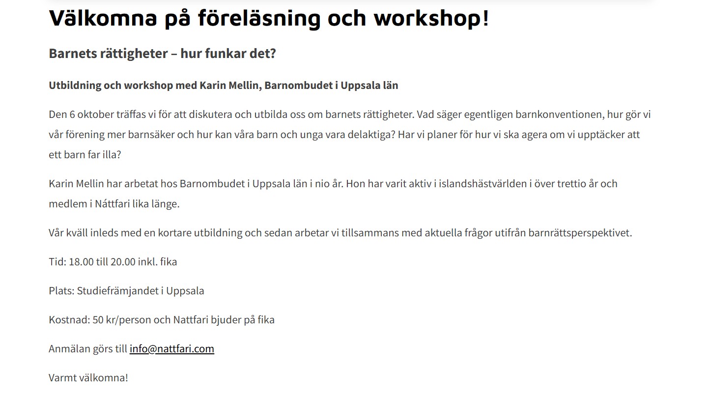 Nattfari arrangerar en utbildning och workshop med Karin Mellin, Barnombudet i Uppsala.